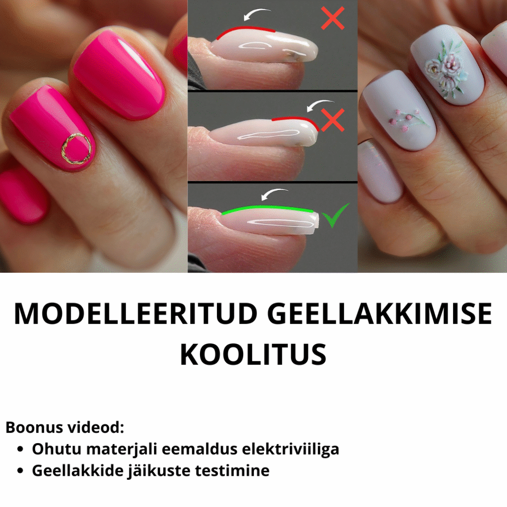 BOONUS materjalid: Geellaki eemaldamine elektriviiliga. Geellaki baaside ja top-geelide jäikuse testimine. Koolitus ei sisalda eraldi maniküüri kursust. Koolituse läbimisel saadetakse õppijale tõend lihtkirjana postkasti. Koolitust saab vaadata 6 kuud.